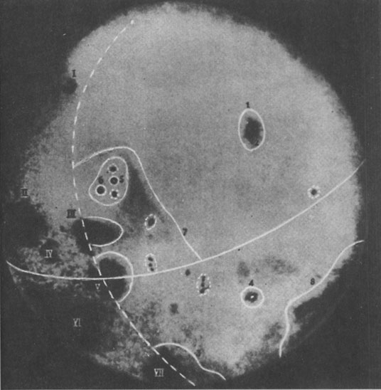Вот он, перед нами, первый снимок обратной стороны Луны, достигший Земли, благодаря станции “Луна-3”. И, какие радующие слух названия Море Москвы, Море Мечты, Южное Море, горный хребет Кордильеры, залив Астронавтов, кратер Ломоносов, кратер Жолио-Кюри, горный хребет Циолковский - все увиденное, названо по имени. Лунных людей не обнаружено. Или они перебежали на другую сторону.