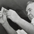 Виктор Баранов, бывший фальшивомонетчик из СССР рассматривает современные купюры. 2013 год
