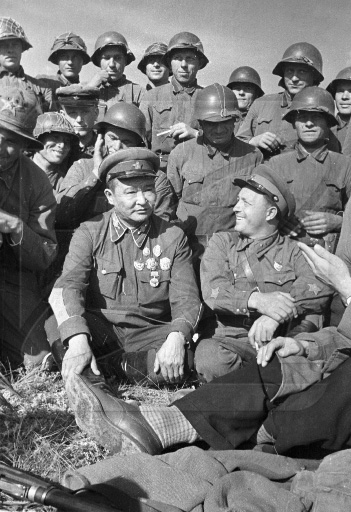 Генерал Георгий Жуков и маршал Чойбалсан с солдатами. Халхин-Гол