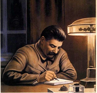 Плакат, изображающий Сталина за работой. рядом - наркомовская лампа -