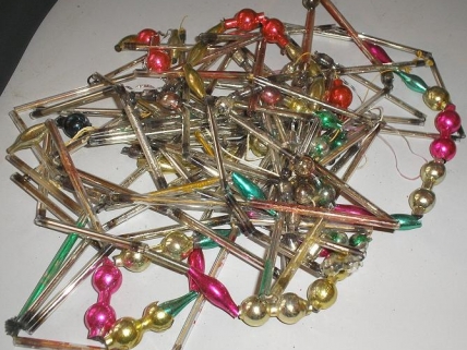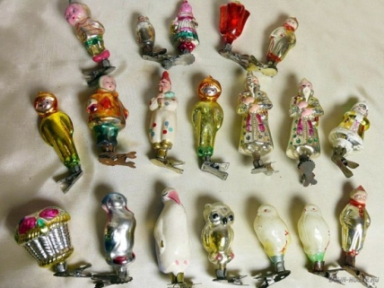 В 50-х главной темой советских елочных игрушек была эстетизация бытовой жизни. На елках появляются чайнички, самоварчики, кувшинчики, будильники, лампы и корзиночки с конфетами. Герои ёлок 60-х годов это такие елочные игрушки как - космонавты, спутники, ракеты, шары и флажки с надписями на тему освоения космоса. Плюс «праздник урожая»: морковки, помидоры, огурцы, яблоки и, конечно, кукуруза. 70-80 вытесняя елочные игрушки СССР, выводят на первый план немецкие шары, спирали и острые верхушки, постепенно вытеснившие красные звезды, которыми до этого принято было украшать вершины ёлок